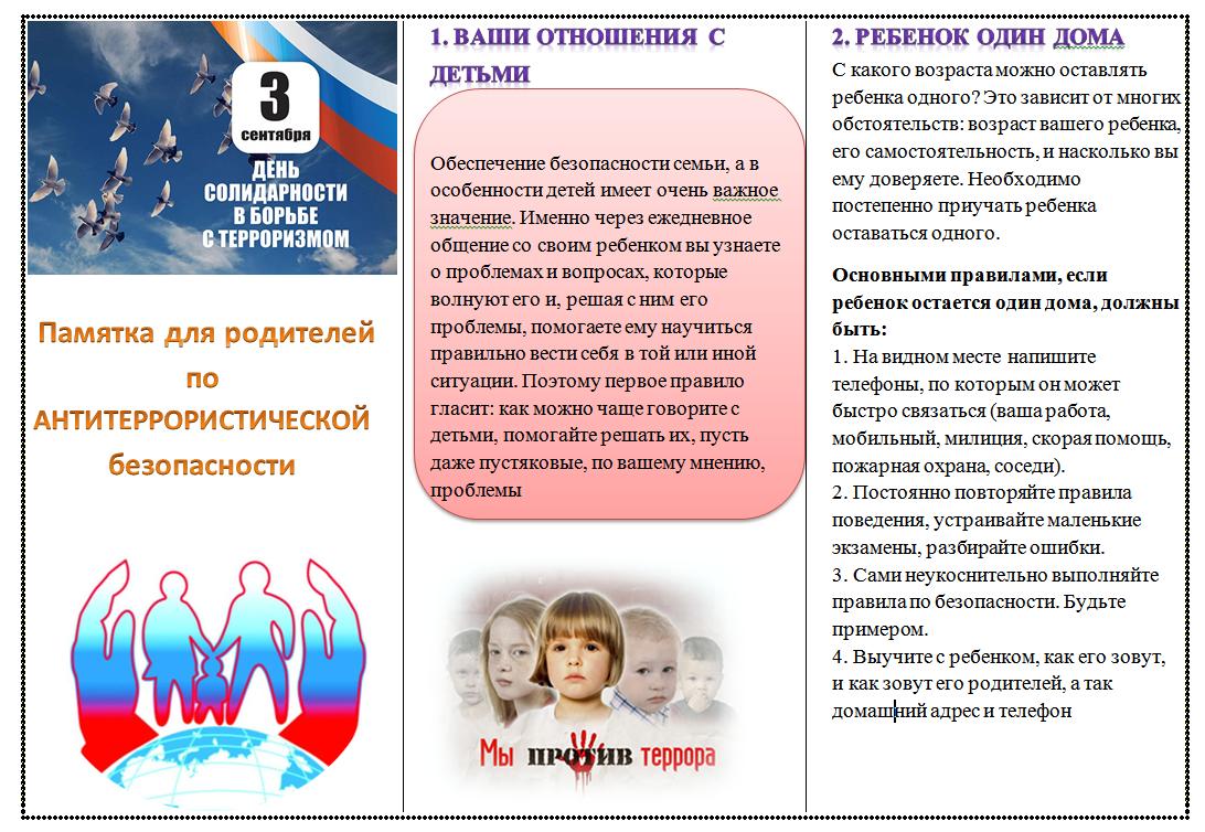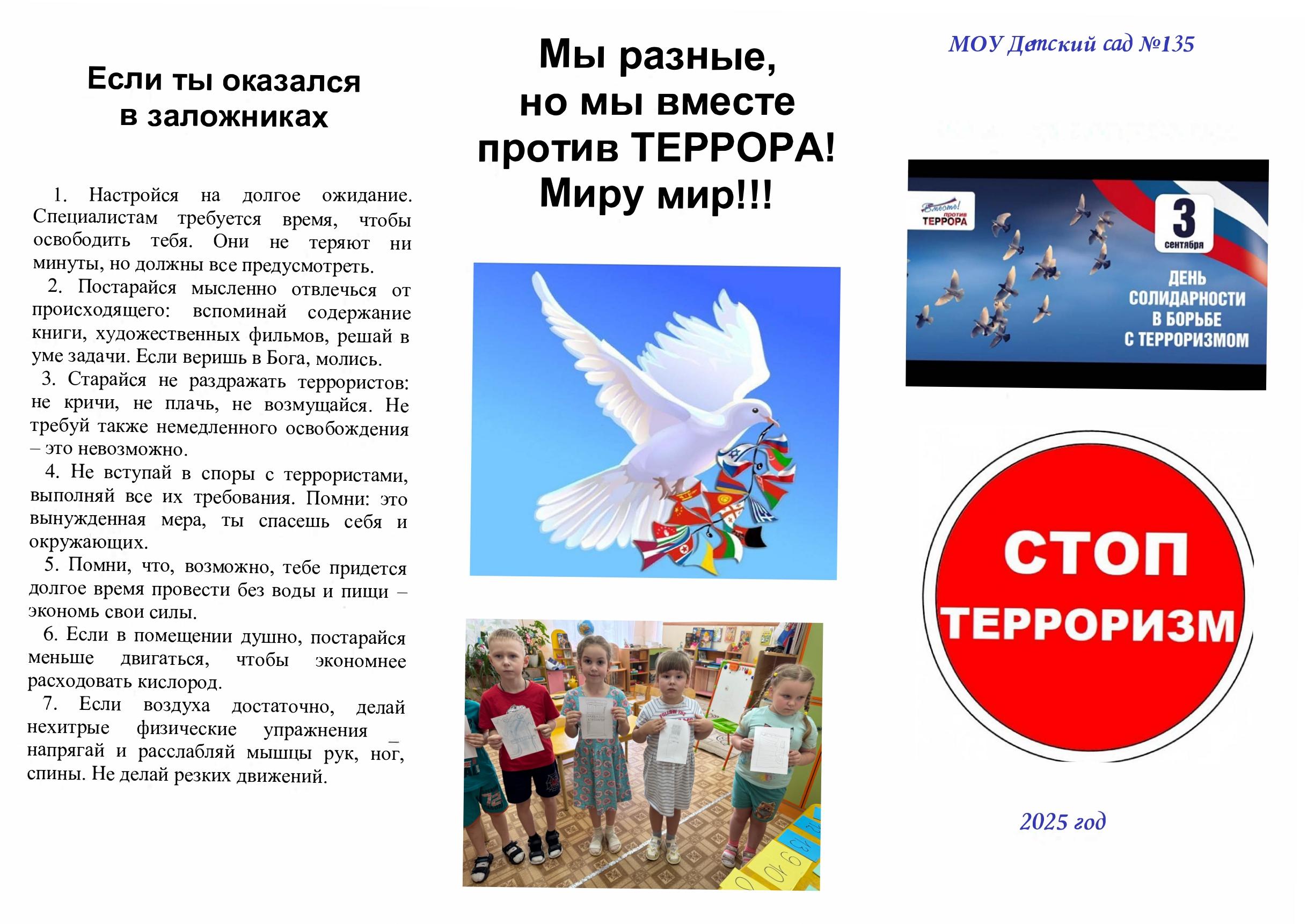 В нашем детском саду в подготовительной группе прошло мероприятие, посвящённое Дню солидарности в борьбе с терроризмом. Ребятам была показана презентация, проведена беседа на тему «Терроризм и личная безопасность», игра «Если бы…».